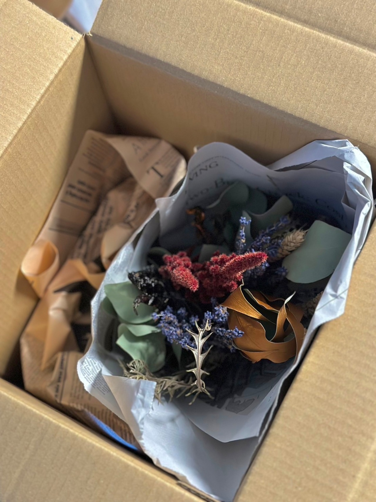 写真のような英字新聞にお包みし、配送用 boxでお届けいたします。